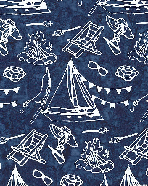 A scatter of sailboats, campfires, and other lakeside-camping motifs are depicted in vivid hues within mottled batik textures. Batik, larger objects are about 5" from the 'Places You'll Go' collection by Riley Blake Designs.