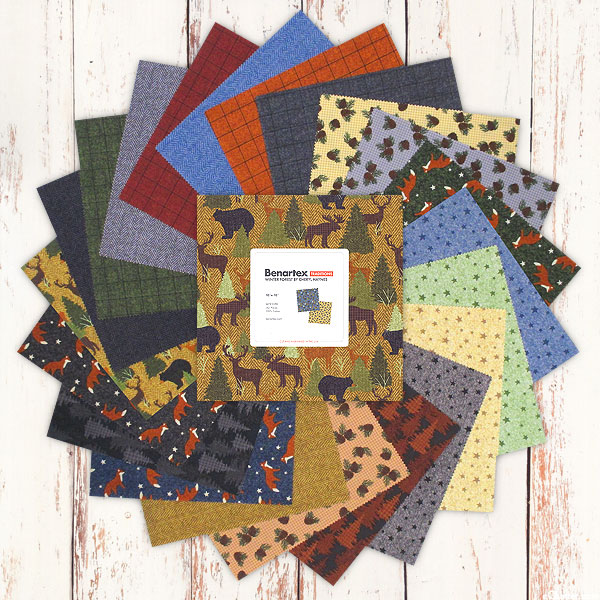 A woodsy assortment of wild animals, cozy plaids, and forest trees come together in this charming pre-cut! 'Winter Forest' collection ten-square by Cheryl Haynes for Benartex Fabrics. Pack includes forty-two 10" x 10" squares.