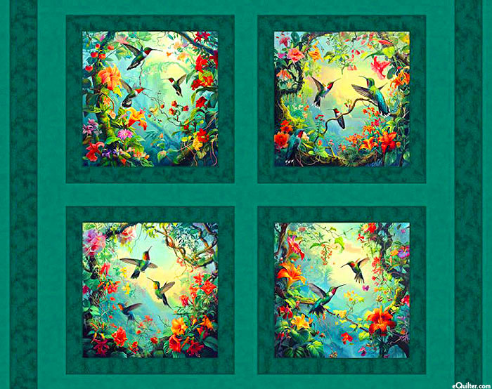 Small and elegant hummingbirds are seen fluttering between a lush expanse of floral scenery in the blocks of this panel. Digitally printed, 36" panel, 'Tropical Hummers'.