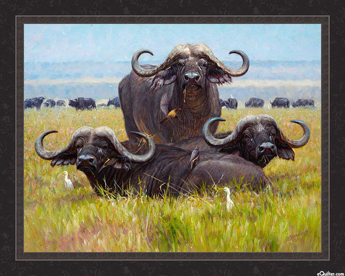 A group of buffalo sit happily surrounded by little birds while more buffaloes roam in the background. Digitally printed, 36" panel, 'Nyati In The Sweet Grass' by John Banovich Licensed by Ansada Licensing Group, LLC.