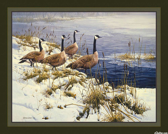 A flock of geese stand on the banks of a lakeside, with cattails poking up amongst ice and snow. Digitally printed, 36" panel, 'Among The Cattails' by John Seerey-Lester Licensed by Ansada Licensing Group, LLC.