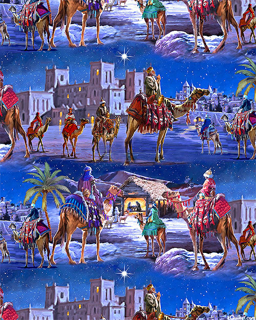 Scenes from the nativity of Jesus Christ are depicted across the design including Mary & Joseph gazing upon their newborn child, and the three wise men ponder the star that led them to Bethlehem. Digitally printed, wider stripes are about 3", stripes run from selvedge to selvedge, from the 'Let Us Adore Him' collection by The MacNeil Studio for 3 Wishes Fabric.