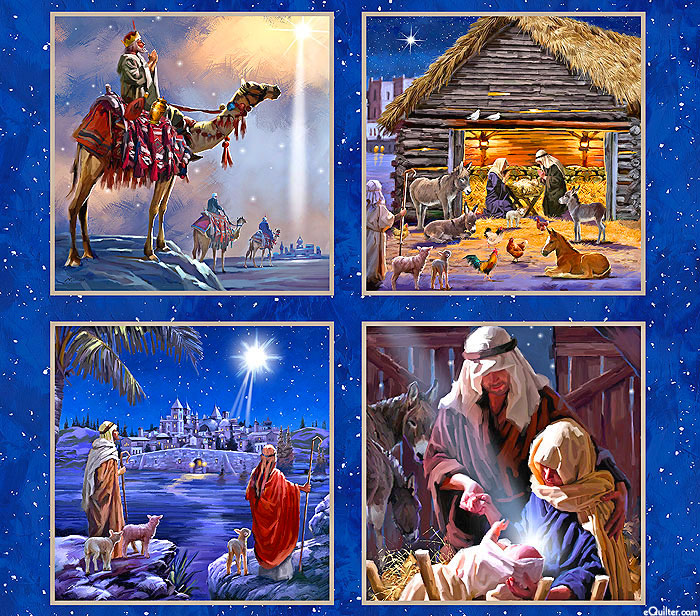 Scenes from the nativity of Jesus Christ are depicted in the blocks of the panel including Mary & Joseph gazing upon their newborn child, and the three wise men ponder the star that led them to Bethlehem. Digitally printed, 36" panel, panel has four frames about 15-1/2" x 15-1/2", from the 'Let Us Adore Him' collection by The MacNeil Studio for 3 Wishes Fabric.