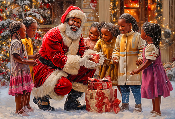 Beloved African American Santa stands in the fresh winter snow as he spreads joy and cheer among the children of the town. Digitally printed, 29" panel, 'Santa's Gifts' by the Rubin Design Studio, designed exclusively for eQuilter.