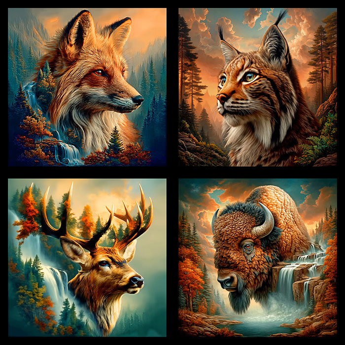 Panel blocks that can be sewn into pillows contain spirit beasts including a fox, lynx, elk, and bison. Digitally printed, 43" panel, includes four 20" x 20" frames, 'Wilderness View Pillow Panel 2' by the Rubin Design Studio, designed exclusively for eQuilter.