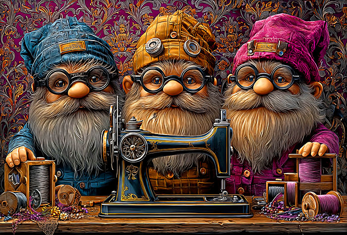 A trio of handsome gnomes tends to an antique sewing machine as colorful buttons and spools of thread are laid out on the table of this picturesque panel. Digitally printed, 29" panel, 'Sewing Gnomes Trio' by the Rubin Design Studio, designed exclusively for eQuilter.