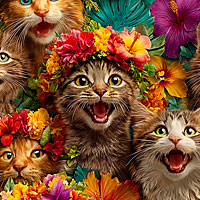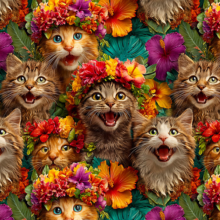 Cute kittens are piled between colorful flower blossoms in this adorable pet-lovers design. Digitally printed, kitten faces are about 3", 'Kitty Flower Party 1' by the Rubin Design Studio, designed exclusively for eQuilter.