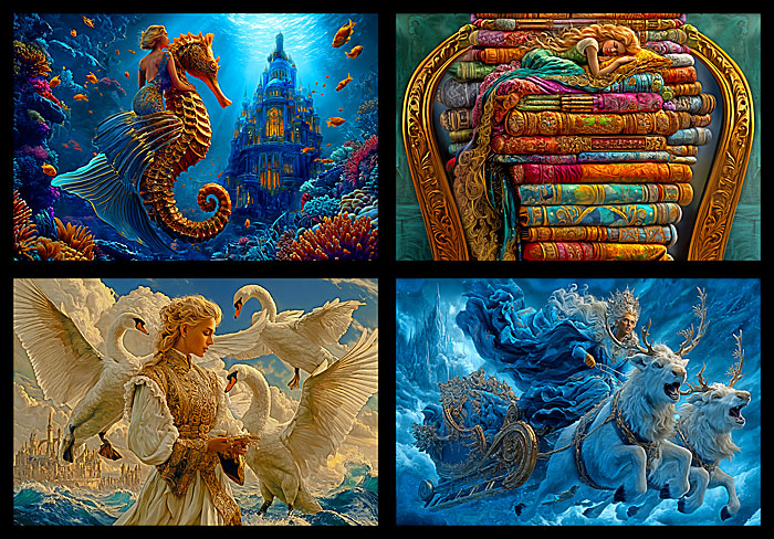 Iconic scenes from beloved fairy tale author, Hans Christian Andersen, come to life in the blocks of this picturesque panel. Stories include The Little Mermaid, The Wild Swans, The Snow Queen, and The Princess and the Pea. Digitally printed, 30" panel, includes four 20" x 14" frames, 'Children's Stories' by the Rubin Design Studio, designed exclusively for eQuilter.