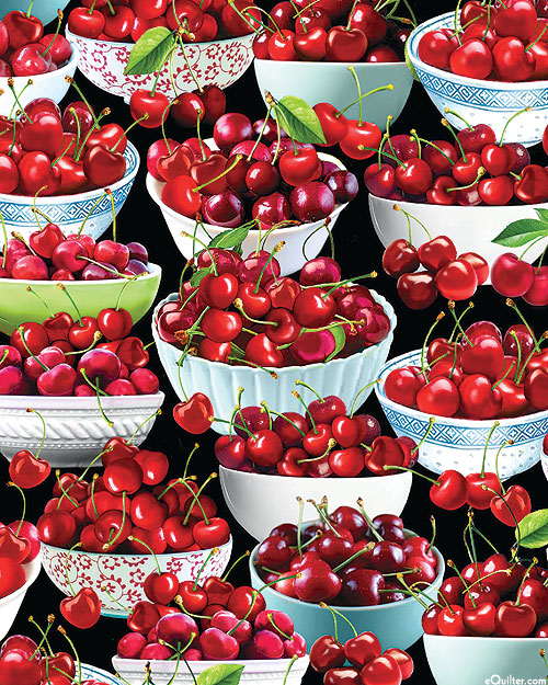 A variety of bowls are overflowing with succulent cherries. Digitally printed, larger bowls are about 3-1/2", 'Bowl Of Cherries' from the 'Cherry Hill' collection by Kanvas Studio for Benartex Fabrics.