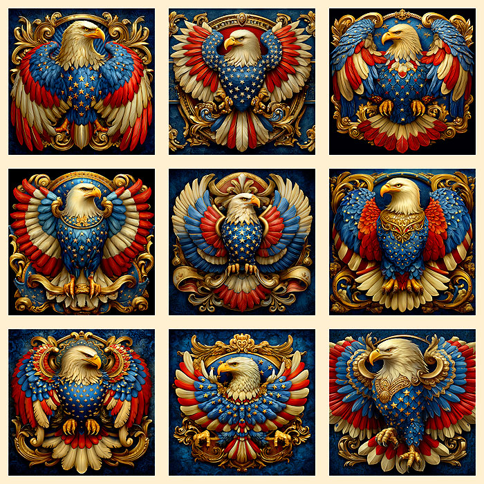 Blocks contain emblems of Bald Eagles emerging from the American flag itself in breathtaking expressions of freedom across the proudly patriotic panel. Digitally printed, 43" panel, includes nine 13" x 13" frames, 'Patriotic Eagle Blocks' by the Rubin Design Studio, designed exclusively for eQuilter.