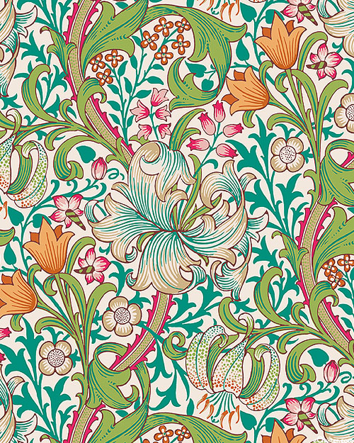 Elegant scrolling lilies are surrounded by a variety of other elegant flowers all designed in William Morris' iconic style. Larger flowers are about 3-3/4", 'Golden Lily' from the 'Bedford Park' collection by Morris & Co. for Free Spirit.