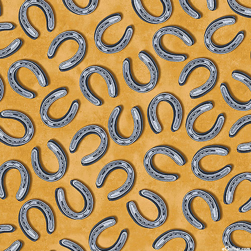 Finely crafted horseshoes are scattered across the design. Digitally printed, larger horseshoes are about 3/4", 'Tossed Horseshoes' from the 'Yellowstone' collection by Kanvas Studio for Benartex Fabrics.
