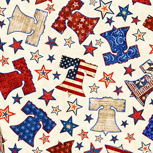 Liberty bells and brilliant stars are scattered across this proudly patriotic design. Digitally printed, larger bells are about 1-1/4", from the 'American Freedom' collection. Printed in the USA.