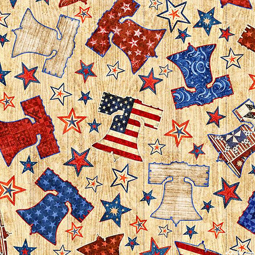 Liberty bells and brilliant stars are scattered across this proudly patriotic design. Digitally printed, larger bells are about 1-1/4", from the 'American Freedom' collection. Printed in the USA.