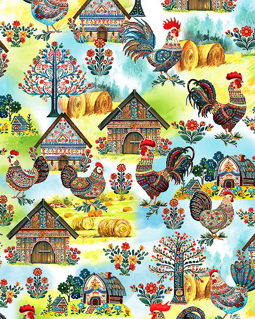 A flock of proud roosters and hens strut their stuff in front of colorful barns and trees patterned in a vibrant folk art-style. Digitally printed, larger roosters are about 4", 'Folk Farm Scenic' from the 'Farm Feathered Folk' collection by Nicole DeCamp for Benartex Fabrics.