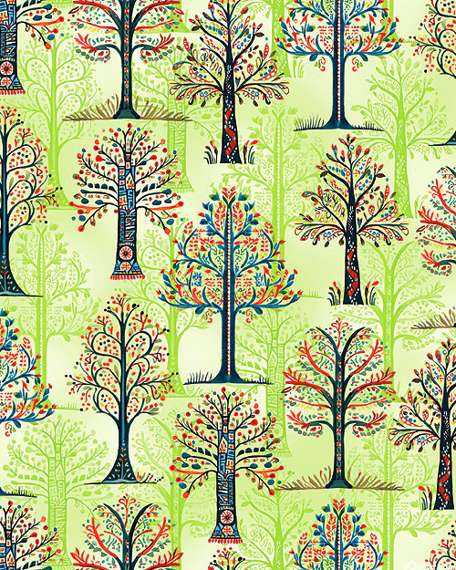 Tall trees growing peacefully in the forest are accented in colorful patterns reminiscent of folk art. Digitally printed, taller trees are about 4", 'Folklore Forest' from the 'Farm Feathered Folk' collection by Nicole DeCamp for Benartex Fabrics.