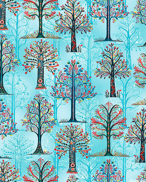 Tall trees growing peacefully in the forest are accented in colorful patterns reminiscent of folk art. Digitally printed, taller trees are about 4", 'Folklore Forest' from the 'Farm Feathered Folk' collection by Nicole DeCamp for Benartex Fabrics.