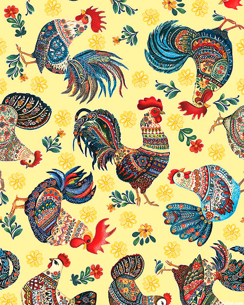 A flock of proud roosters and hens strut their stuff across the design as small florals are tossed in the space between. Digitally printed, larger roosters are about 3-1/2", 'Feathered Friends' from the 'Farm Feathered Folk' collection by Nicole DeCamp for Benartex Fabrics.