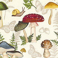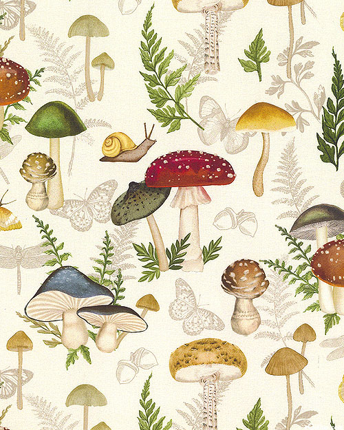 Snails and butterflies wander between a fantastical fungi forest in this delightful design. Larger mushrooms are about 3-1/2", 'Mushrooms' by Nicole Tamarin for Springs.