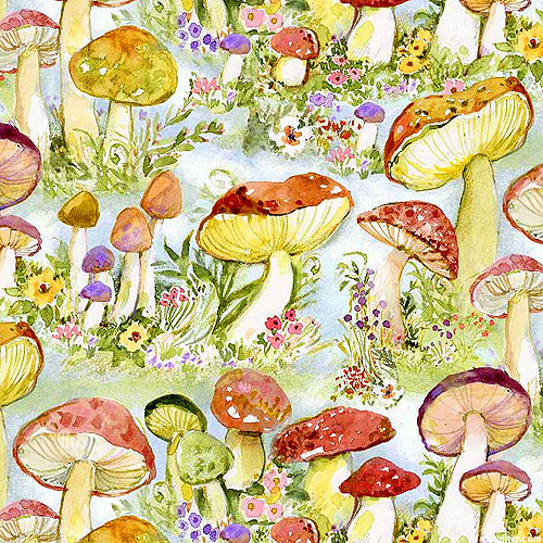 Lush florals and flourishing fungi bring a natural charm to this vibrant design. Larger mushrooms are about 3-1/2", 'Mushrooms Packed' by Susan Winget for Springs. Sold for noncommercial home use only. Other uses prohibited.