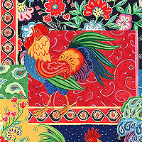 Colorful roosters strut their stuff against an energetic patchwork of paisley and floral patterns. Larger roosters are about 5-1/2", 'Calico Red Rooster Patch' by Susan Winget for Springs. Sold for noncommercial home use only. Other uses prohibited.