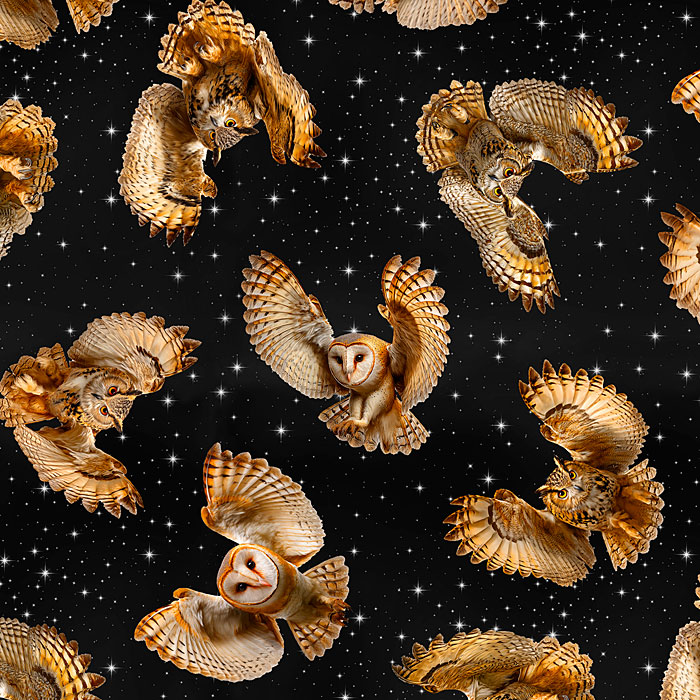 Owls caught in mid-flight are seen scattered against a starry background in this enchanting print. Digitally printed, larger owls are about 4-1/2" 'Night Owls' by the Rubin Design Studio, designed exclusively for eQuilter.
