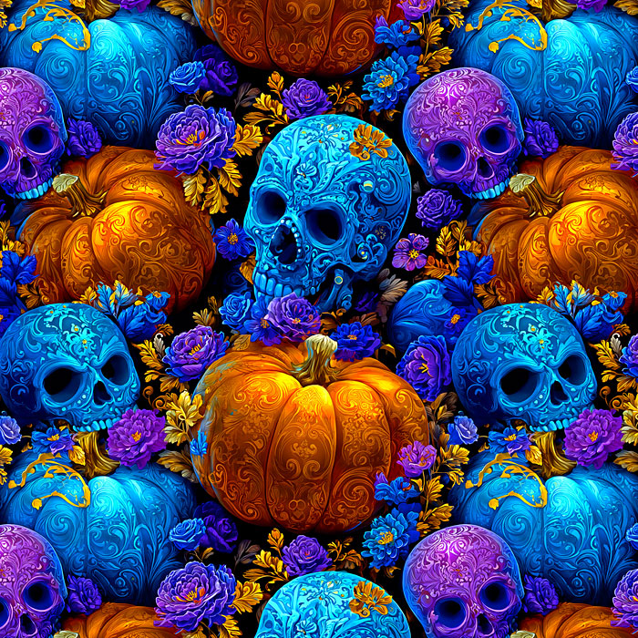 Pumpkins and skulls are decorated in bright colors and flourishing filigree evoking the aesthetics of both Halloween and Mardi Gras. Digitally printed, pumpkins are about 3-3/4" 'Halloween Pumpkins & Skulls' by the Rubin Design Studio, designed exclusively for eQuilter.