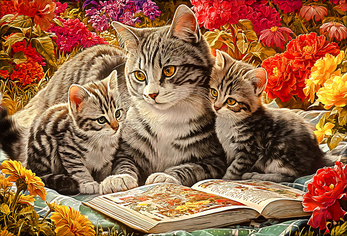 A mama kitty and her two adorable kittens huddle close as they read a book together amidst a lush and flowery garden in this cute and cuddly panel. Digitally printed, 29" panel, 'Storybook Kitties' by the Rubin Design Studio, designed exclusively for eQuilter.