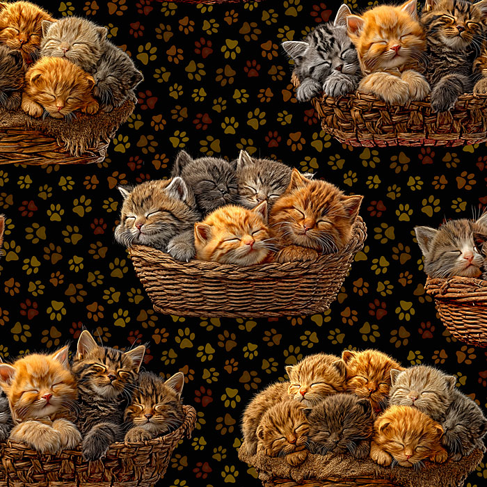 Sleepy kitties are piled on top of one another within baskets in this cute and cuddly print. Digitally printed, baskets of kittens are about 4-1/2" 'Kittens in a Basket Allover' by the Rubin Design Studio, designed exclusively for eQuilter.