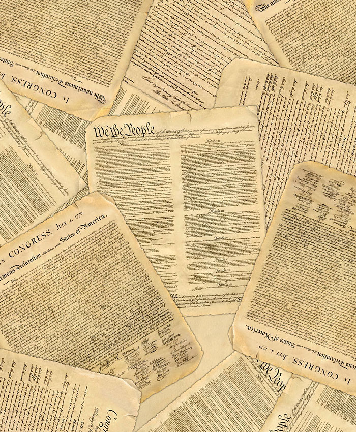 The Charters of Freedom (the Constitution, the Declaration of Independence, and the Bill of Rights) are scattered across this proudly patriotic print. 108" wide quilt backing, digitally printed, document pages are about 8", 'American Foundational Documents Backing' by the Rubin Design Studio, designed exclusively for eQuilter.