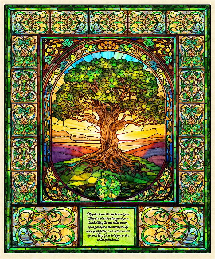 A stained glass rendition of the tree of life comes to life as a mesmerizing mosaic full of color shimmers across this picturesque panel. Digitally printed, 36" panel, from the 'Spirit of Ireland' collection by the Dan Morris for Quilting Treasures.