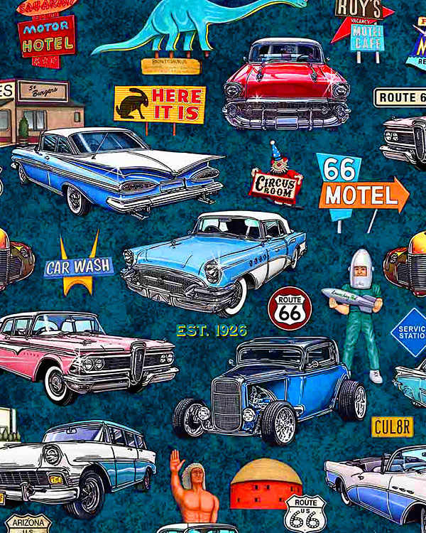 Classic cars and motorcycles from a bygone era are depicted in front of iconic signs from Route 66. Digitally printed, larger cars are about 5", from the 'Get Your Kicks 2026' collection by Dan Morris for Quilting Treasures.