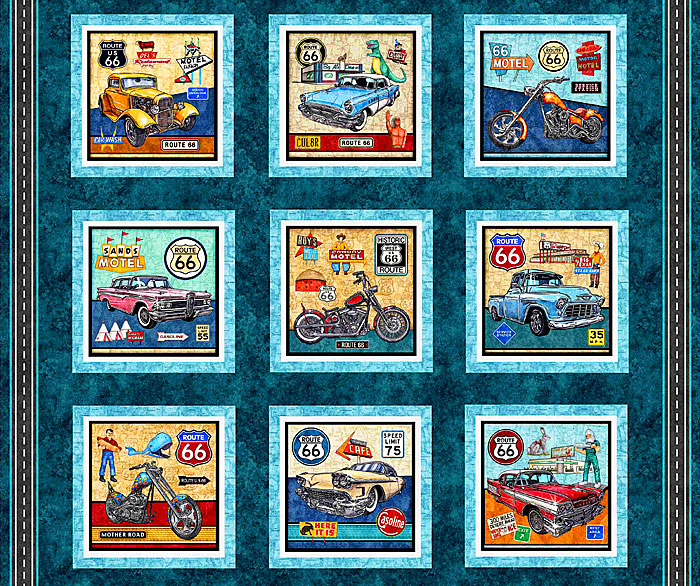 Panel blocks contain classic cars and motorcycles from a bygone era are depicted in front of iconic signs from Route 66. Digitally printed, 36" panel, panel has nine frames about 10" x 10", from the 'Get Your Kicks 2026' collection by Dan Morris for Quilting Treasures.