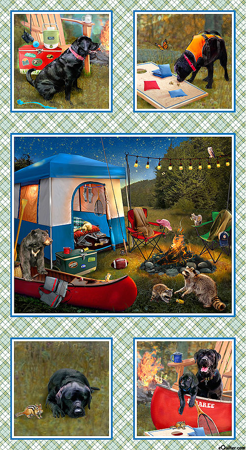 Panel blocks contain woodsy imagery of a family of black labs camping in the forest as they enjoy the wonders of the wilderness together. 24" panel, from the 'Camping Pups' collection by Robert Giordano for Henry Glass.
