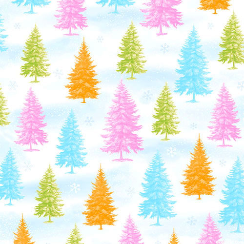 A colorful forest of tall pine trees is accented by subtle snowflakes across this fun and festive print. Digitally printed, taller trees are about 3", 'Snowy Pine' from the 'Homestead Holiday' collection by Charisma Horton for Timeless Treasures.