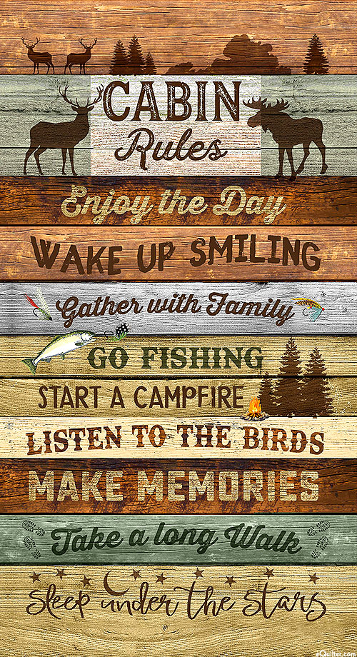 Accented by comforting words of calming encouragement are a medley of forest motifs that coalesce in this cozy woodland design including moose, pine trees, deer, campfires, and mountain fish. Digitally printed, 23" panel, 'Cabin Rules Panel' from the 'Cabin Rules' collection by Timeless Treasures.