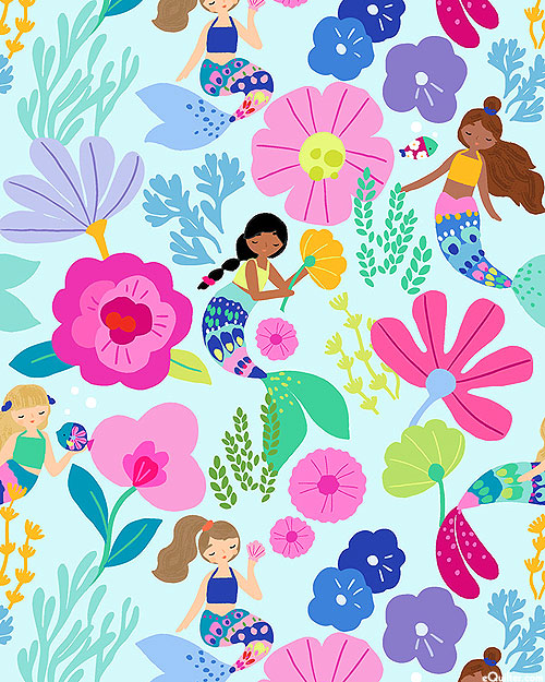 Mystical mermaids frolic among the fish and underwater florals to lend an aquatic allure to this enchanting fabric. Digitally printed, larger mermaids are about 3", 'Make Waves' from the 'Make Waves' collection by Dear Stella, a division of Timeless Treasures.