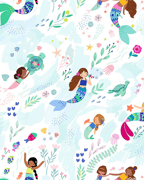 Mystical mermaids swimming beside sea turtles and jellyfish lend an aquatic allure to this enchanting fabric. Digitally printed, larger mermaids are about 2-3/4", 'Free Flow' from the 'Make Waves' collection by Dear Stella, a division of Timeless Treasures.