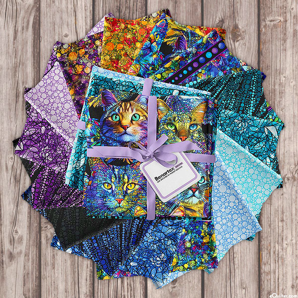 Adorable mosaic kitties are accompanied by a variety of energetic patterns in this charming pre-cut! 'Cat Artistry' collection fat quarter pack by Peggy Collins for Benartex Fabrics. Pack includes fifteen fat quarters.