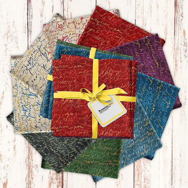 Simple patterns that show off the cursive letters of a skilled hand are presented in a variety of pleasant colors coalesce in this pre-cut that can be used in a wide array of projects! 'Fluidity' collection fat quarter pack by Marta Cortese for Benartex Fabrics. Pack includes nine fat quarters. With gold metallic.