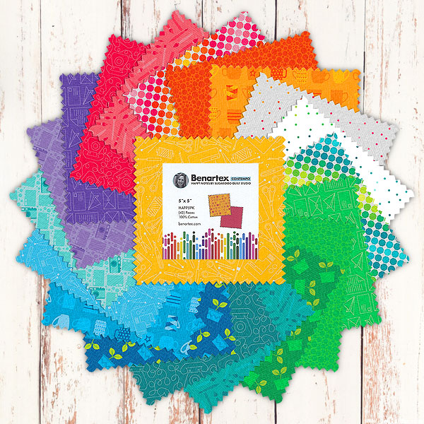 Pleasant designs are presented in a variety of options, making a versatile pre-cut that can be used in a wide array of projects! 'Happy Notes' collection charm pack by Sugaridoo Quilt Studio for Benartex Fabrics, pack includes forty-two 5" x 5" squares.