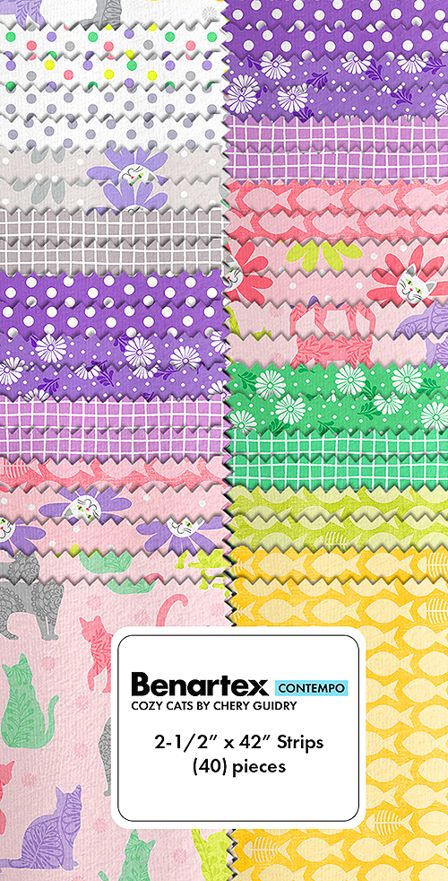 A cozy collection of cat-themed motifs are presented in this charming pre-cut including fish, kitty-faced florals, and stylish kitty cats. 'Cozy Cats' collection strip pack by Cherry Guidry for Benartex Fabrics, pack includes forty 2-1/2" x 42" strips.