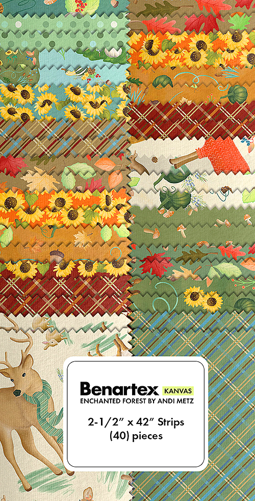 A wholesome spread of happy harvest motifs come together in this delightful pre-cut! 'Enchanted Forest' collection strip pack by Andi Metz for Benartex Fabrics, pack includes forty 2-1/2" x 42" strips.