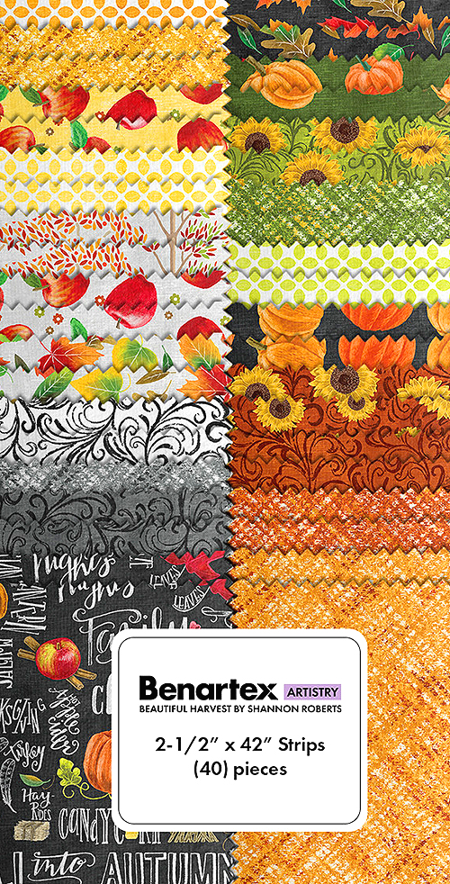 A wholesome spread of happy harvest motifs come together in this delightful pre-cut! 'Beautiful Harvest' collection strip pack by Shannon Roberts for Benartex Fabrics, pack includes forty 2-1/2" x 42" strips.