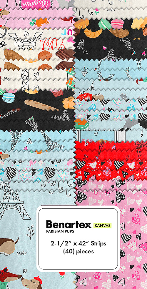 A chic collection of Parisian and puppy motifs coalesce into a fashionable pre-cut brimming with worldly charm! 'Parisian Pups' collection strip pack by Kanvas Studio for Benartex Fabrics, pack includes forty 2-1/2" x 42" strips.
