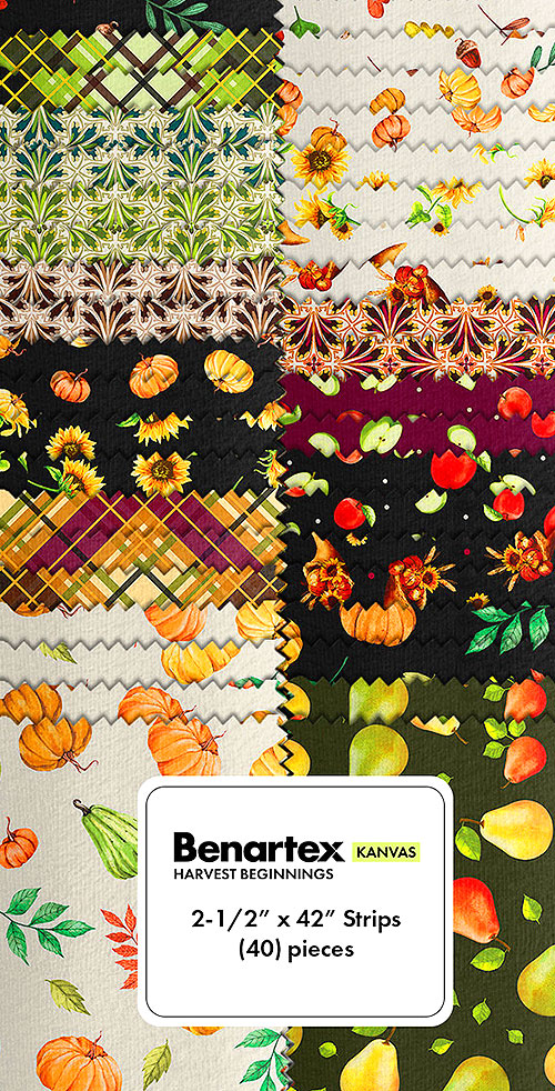 This harvest-themed pre-cut features a variety of Autumnal motifs including pumpkins, sunflowers, apples, and cornucopias.'Harvest Beginnings' collection strip pack by Kanvas Studio for Benartex Fabrics, pack includes forty 2-1/2" x 42" strips.