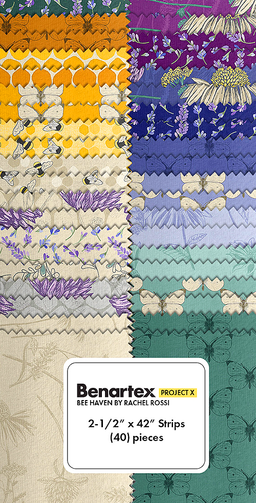 Lush florals, honeybees, and honeycomb patterns coalesce in this bee-lovers pre-cut! 'Bee Haven' collection strip pack by Rachel Rossi for Benartex Fabrics, pack includes forty 2-1/2" x 42" strips.