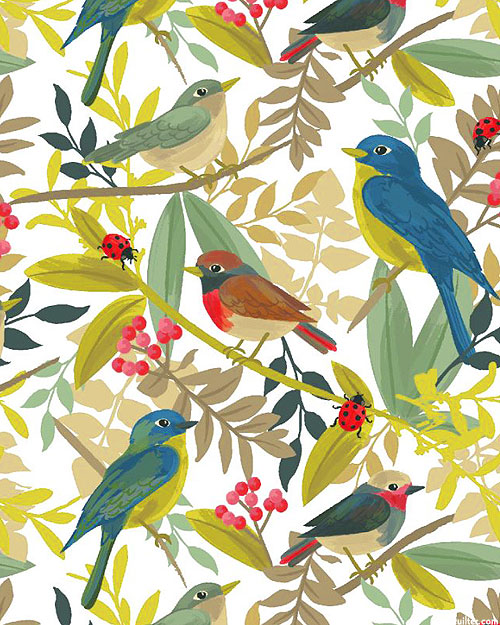 Small chickadee birds perch on thin tree branches ripe with berries and ladybugs across this cozy forest design. Larger birds are about 2-1/2", from the 'Forest Life' collection by Lisa Perry for 3 Wishes Fabric.