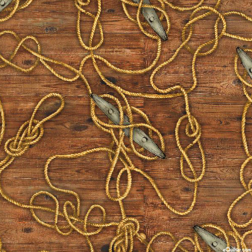 Lengths of rope are tangled and tied into knots across this nautical-themed design. Larger objects are about 1-1/2", from the 'Fair Winds & Following Seas' collection by Michael Moor for 3 Wishes Fabric.