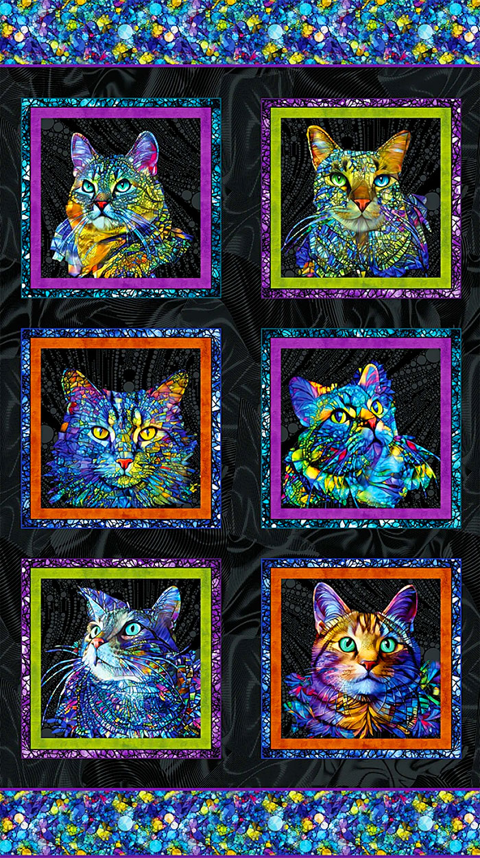 Panel blocks contain an adorable assortment of stained-glass kitty portraits, each showing the unique feline charms of every furry friend. 24" panel, panel has six frames about 10" x 10", 'Cat Artistry Panel' from the 'Cat Artistry' collection by Peggy Collins for Benartex Fabrics.